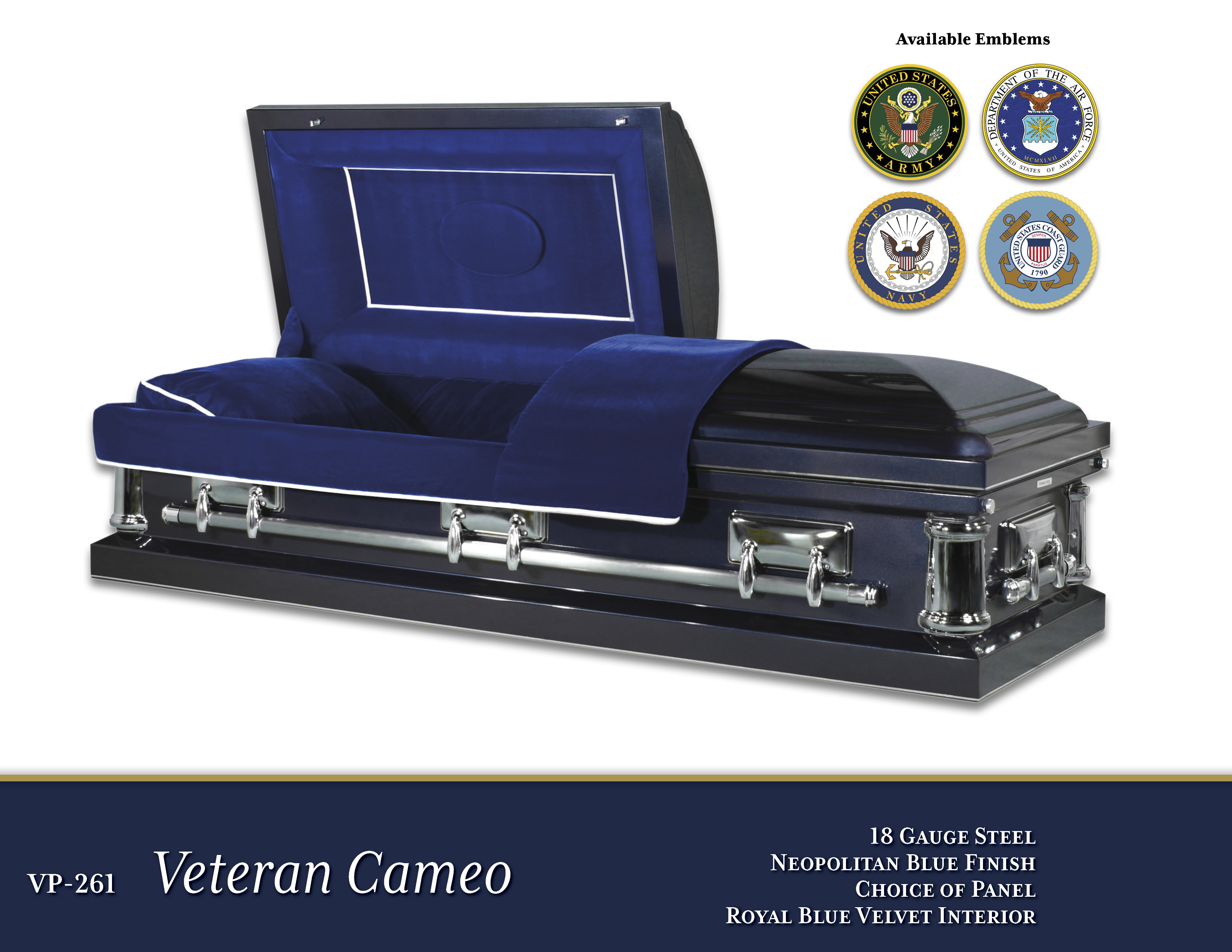 VP-261 Veteran Cameo$5,395.00Price18 Gauge SteelNeopolitan Blue FinishRoyal Blue Velvet InteriorChoice of PanelOpen Shareable Image
